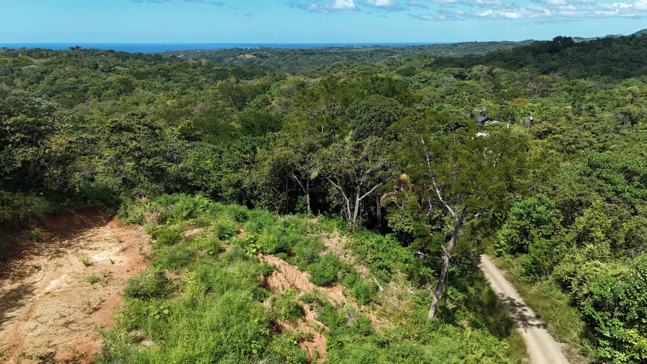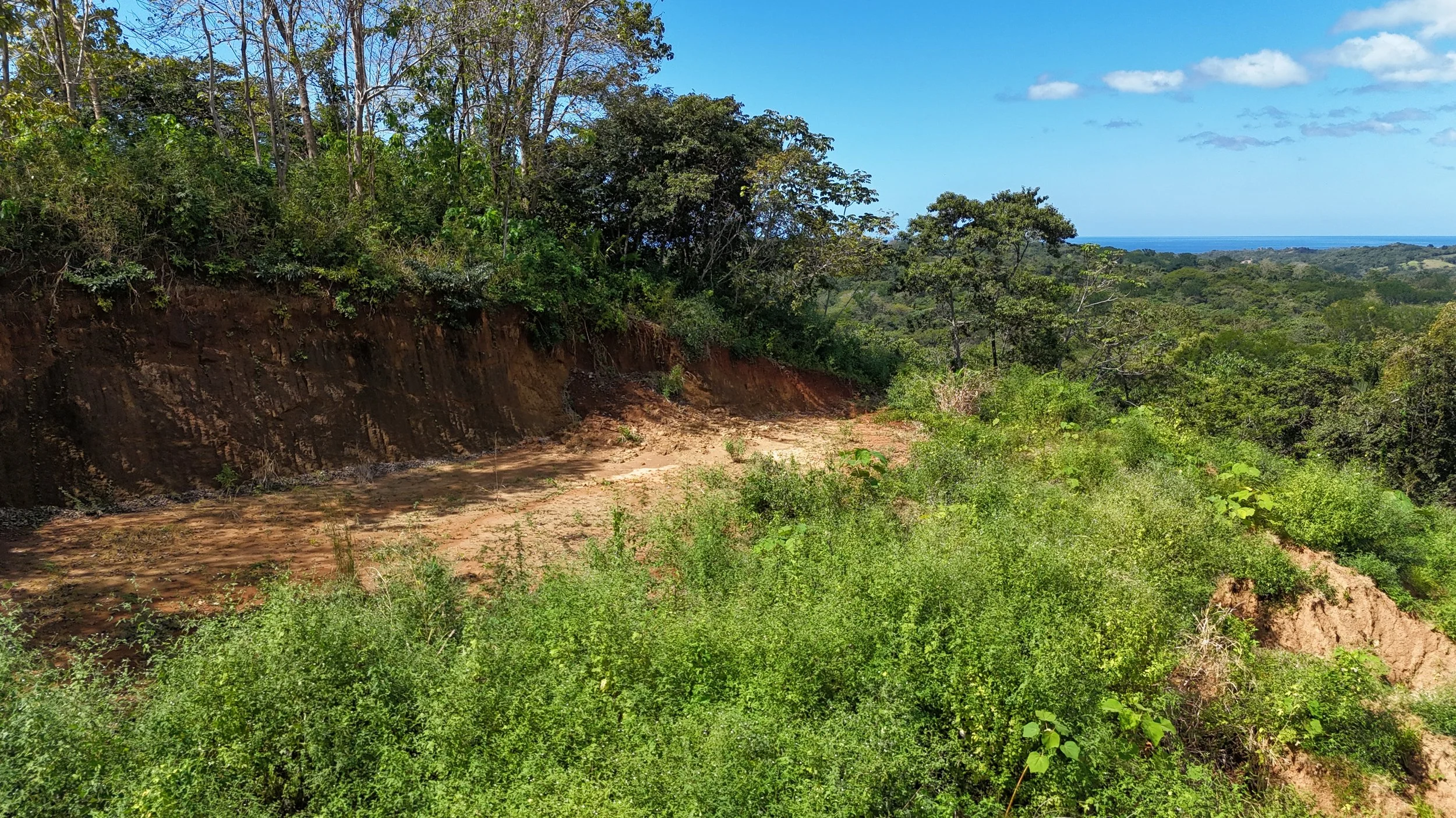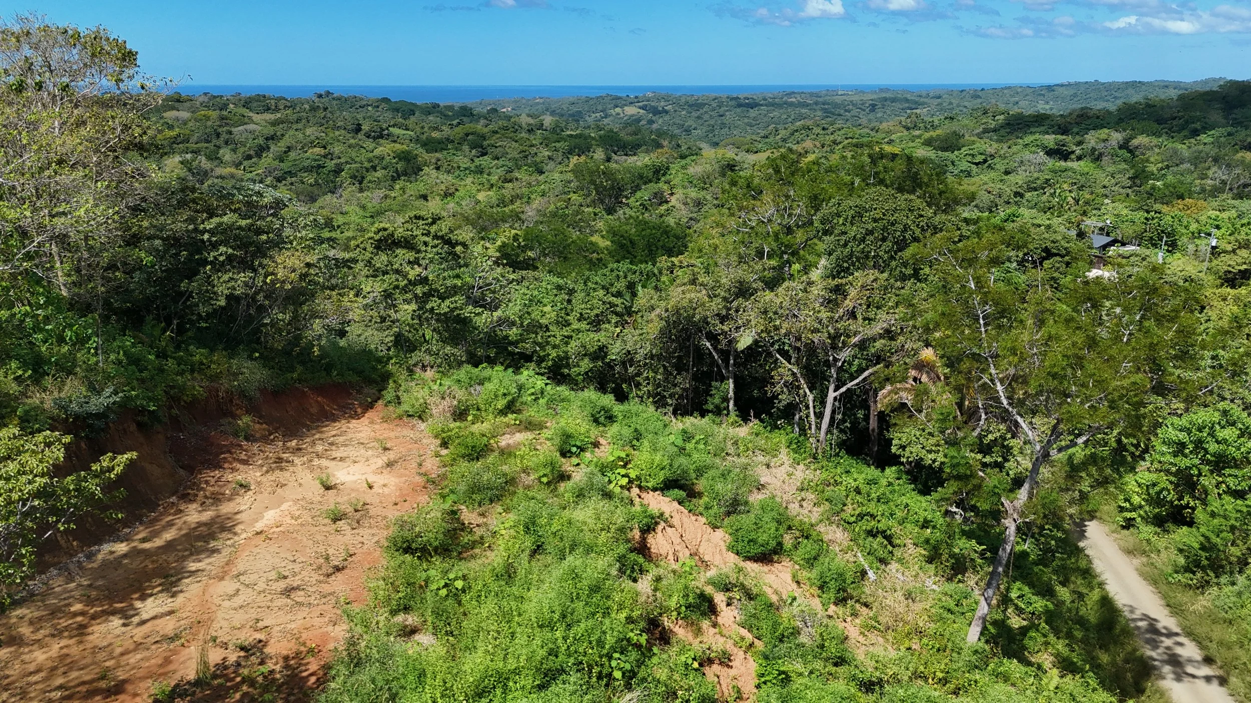 Ruta del Sol community with an amazing jungle setting clubhouse-pool. Lot 43 offers 1,359 m² of usable land with an amazing ocean view. Perfect for building a vacation home, rental project, or a peaceful residence surrounded by nature as you sit in the middle of the jungle with great access public road to the nearby beaches. The property has a lot of trees and palms creating shade making it cool with nice breezes as it’s up high in the mountains. The gentle topography maximizes construction options, there is a terraza built and driveway ready to build. The property sits up on the hill, maintaining privacy and natural beauty. This property can be subdivided as it’s on the public road.
